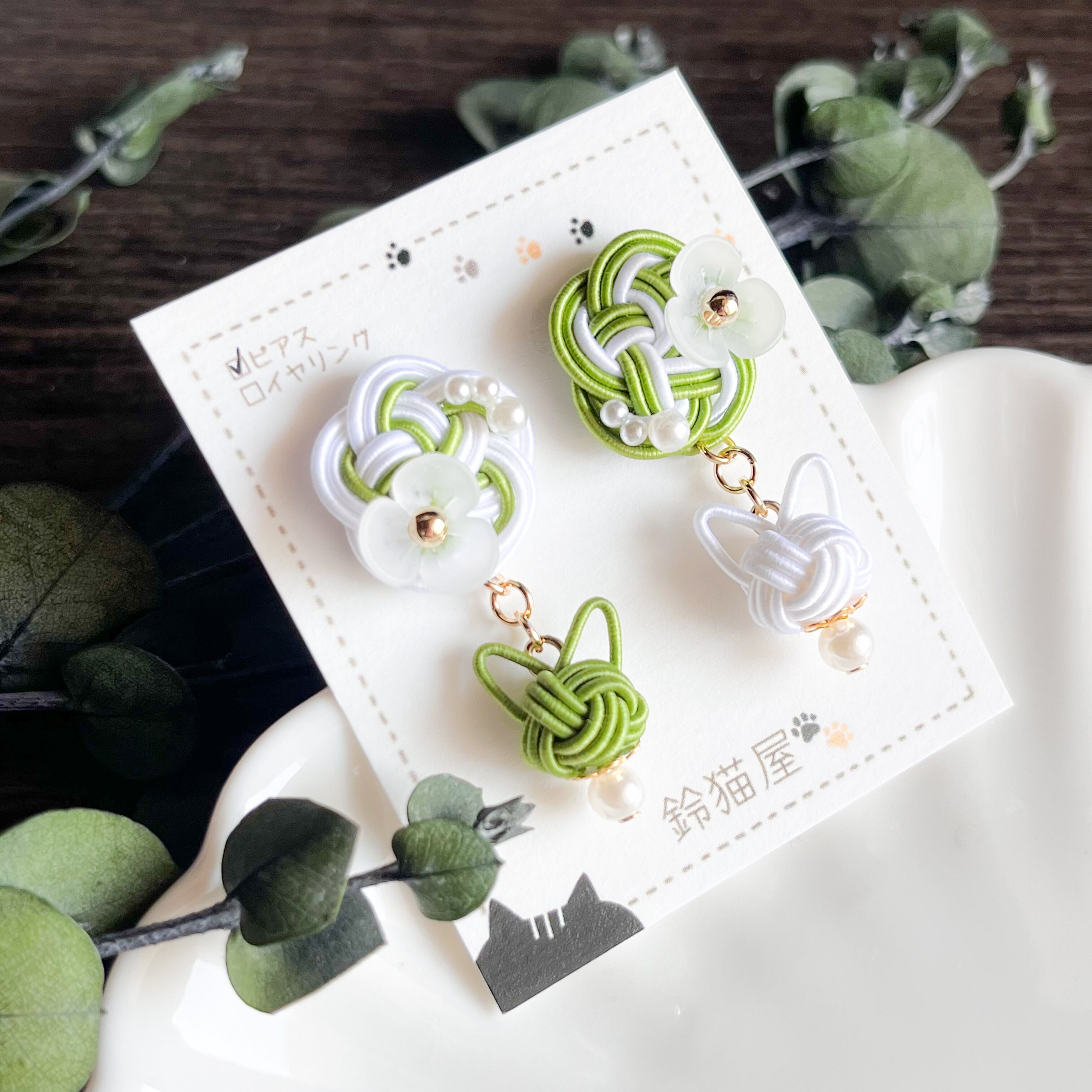 【A-25】花と猫のピアス/イヤリング(抹茶)