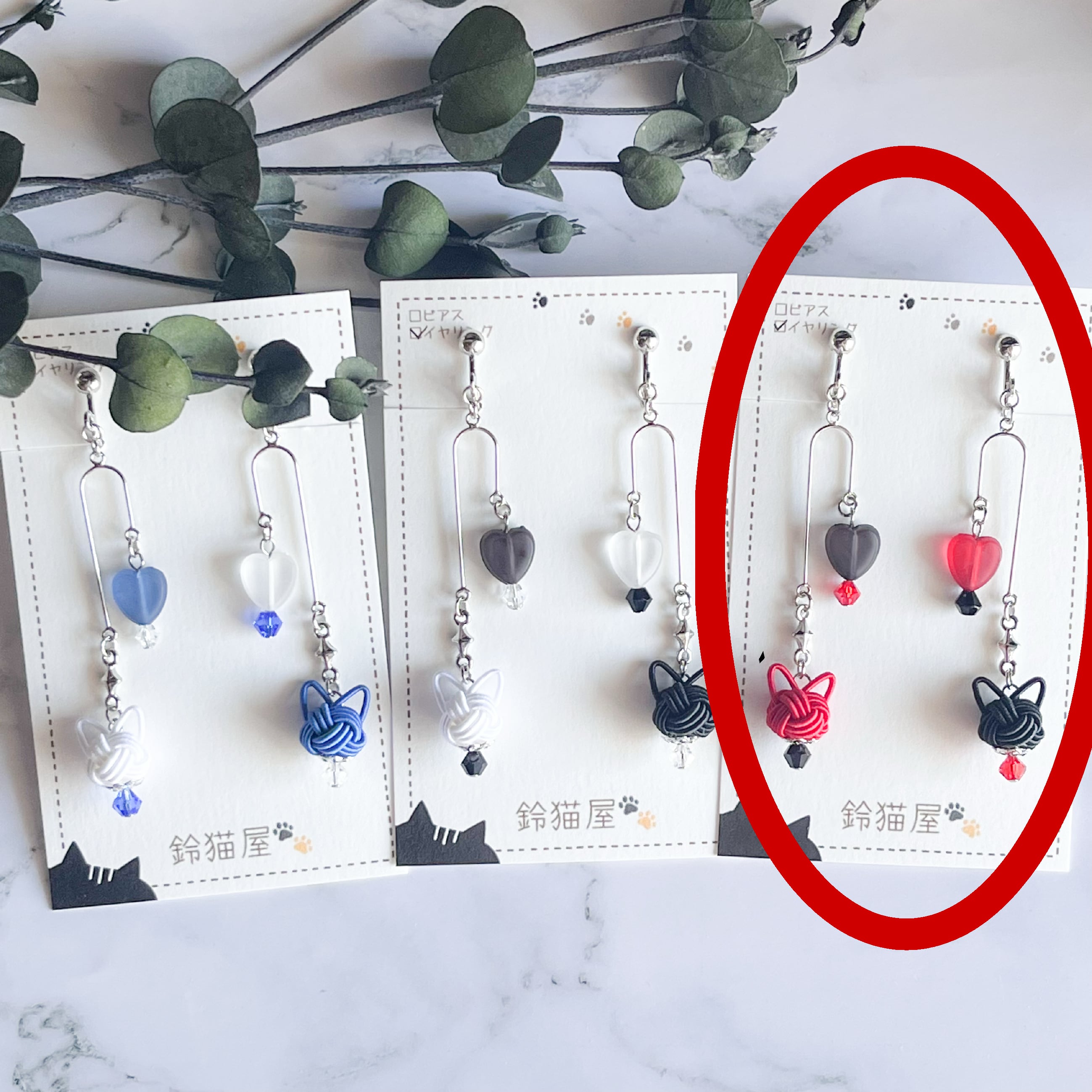 【A-30】シルバーモビール猫ピアス/イヤリング(赤×黒)