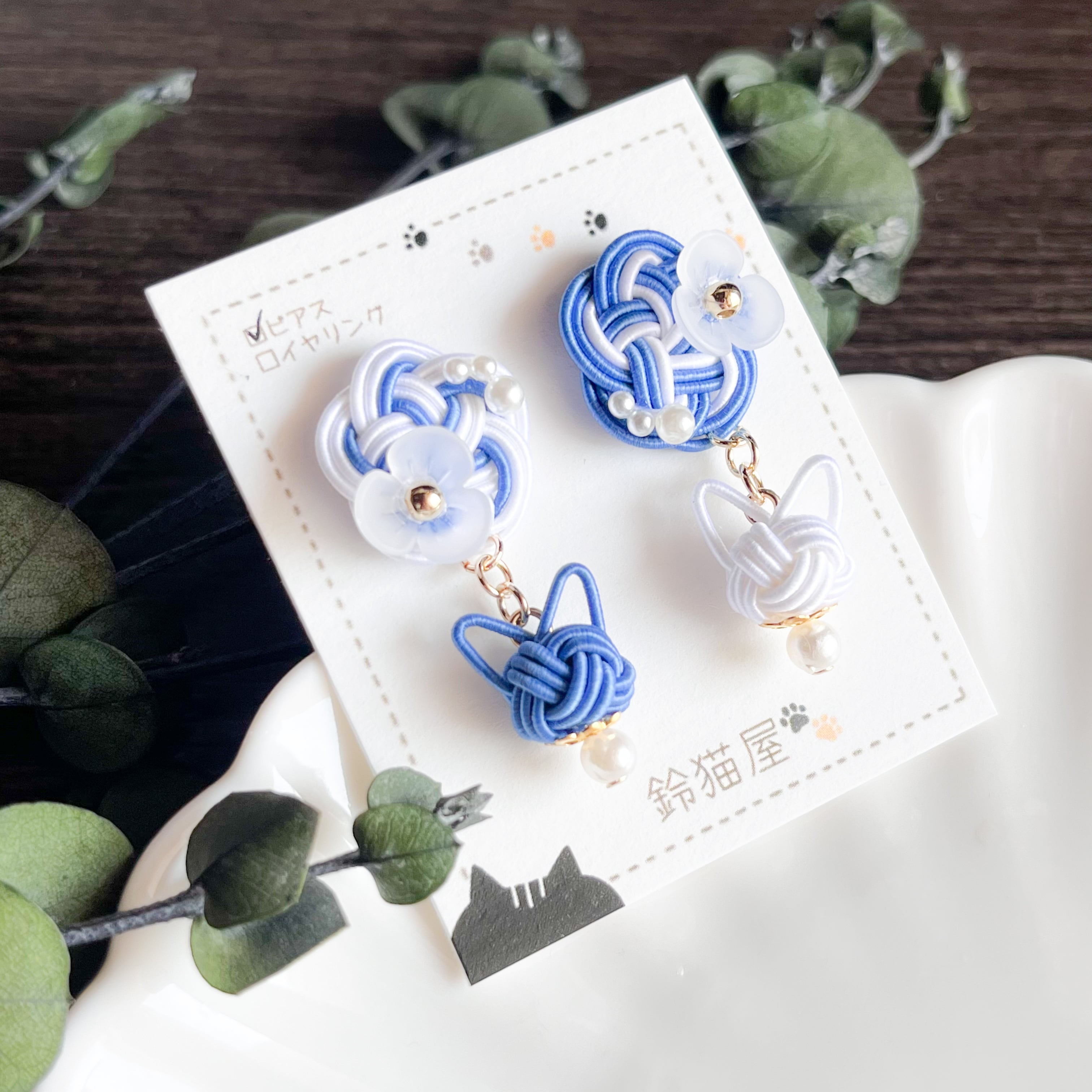 【新春販売会】花と猫のアシンメトリーピアス/イヤリング【青】