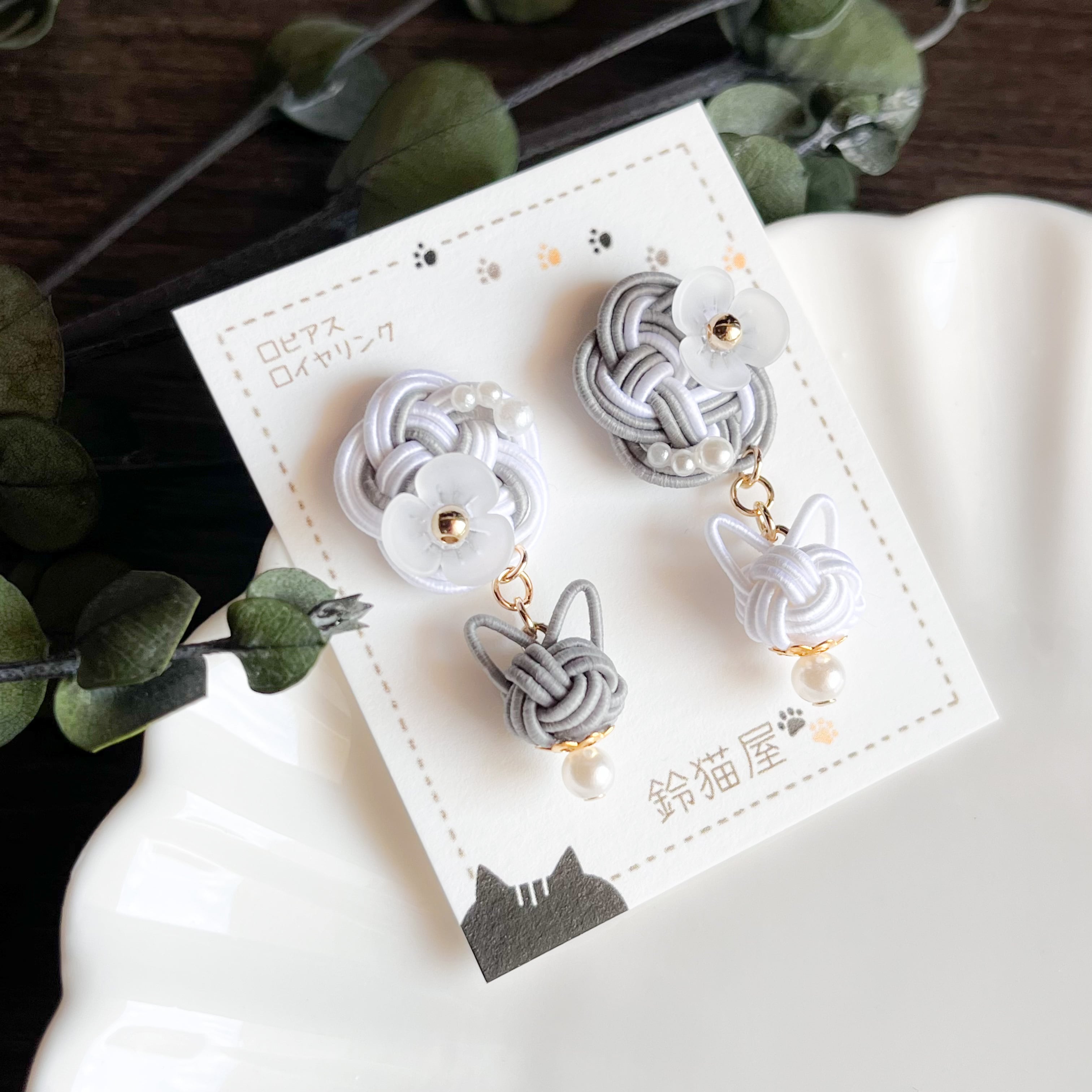 【新春販売会】花と猫のアシンメトリーピアス/イヤリング【黒ごま】